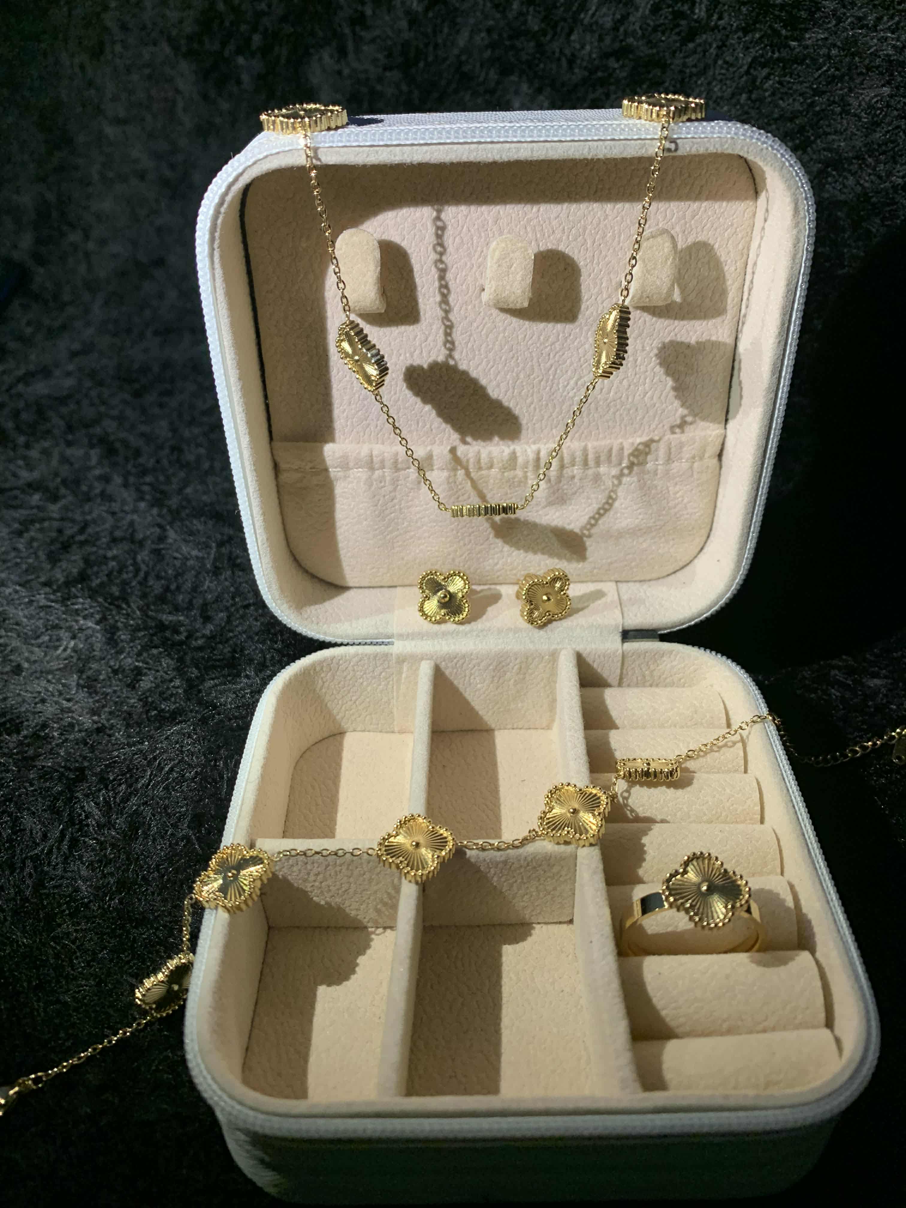 طقم Bella Flora الفاخر من 4 قطع بتصميم زهري أنيق ولمسة ذهبية راقية، يأتي داخل علبة مجوهرات فاخرة تزيد من قيمته وتجعله هدية مثالية لكل امرأة تبحث عن الجمال، الرقة، والتميز.